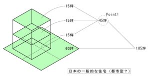 一般的な2階建ての住宅で、屋根面積を少なくした30坪の住宅と平屋の住宅の場合では屋根部分の15坪分のお金は、定着せず他の活用に回っている(都市等に)。「一般的な住宅」では整備分の費用が含まれた土地も合わせると45+60=105坪で家づくり、「郊外での平屋」60坪との「差」の45坪はまた別の財産の定着につながる。