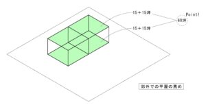 グリーンの部分(土地、床、屋根)が持ち主の占有部分。60坪の土地に床面積30坪の住宅を建てるとして仮定、15+15+15=45坪で建設投資(物を定着)。宅地開発を行った60坪は場所投資で個人の物の定着とは別。これにより105坪の人の動きを保障してくれる部分(テリトリー)をつくった状態。